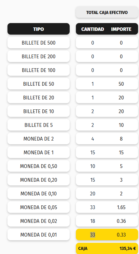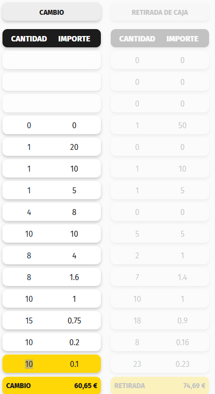 Y al pulsar se activa la columna de CAMBIO, y sólo se activan las denominaciones que tienen cantidad, porque el cambio saldrá de estas monedas o billetes. A medida que vamos indicando las monedas y billetes que dejamos de cambio vemos como la columna de RETIRADA DE CAJA se va actualizando. La diferencia de la columna de Total Caja Efectivo - Cambio = Retirada de Caja