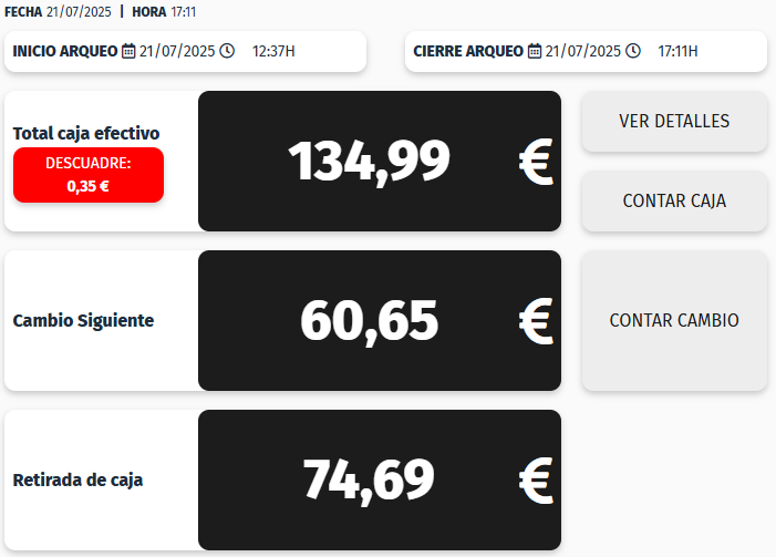 El Arqueo Recomendado, es el sistema recomendado pues utilizamos las herramientas que facilita el programa y guardará toda la información relativa al arqueo, descuadres, cambio y retirada de caja.