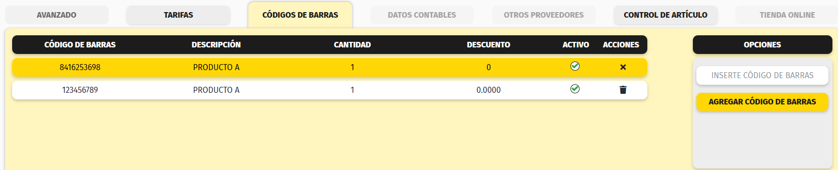 Códigos de Barras: Agrega los diferentes códigos de barras que tenga asignado el artículo.