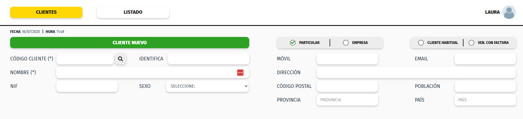 Una vez accedemos a la pantalla de Clientes, nos permite crear una ficha.
