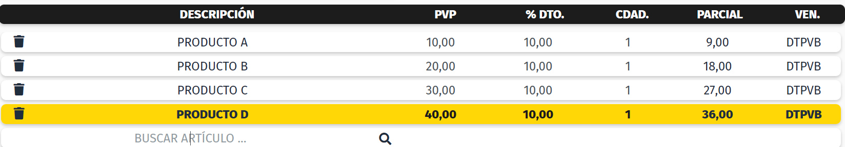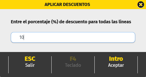1. Sitúa el cursor en el campo %DTO de la línea donde está el artículo del que se desea asignar el descuento. Cambia el descuento y pulsa INTRO.