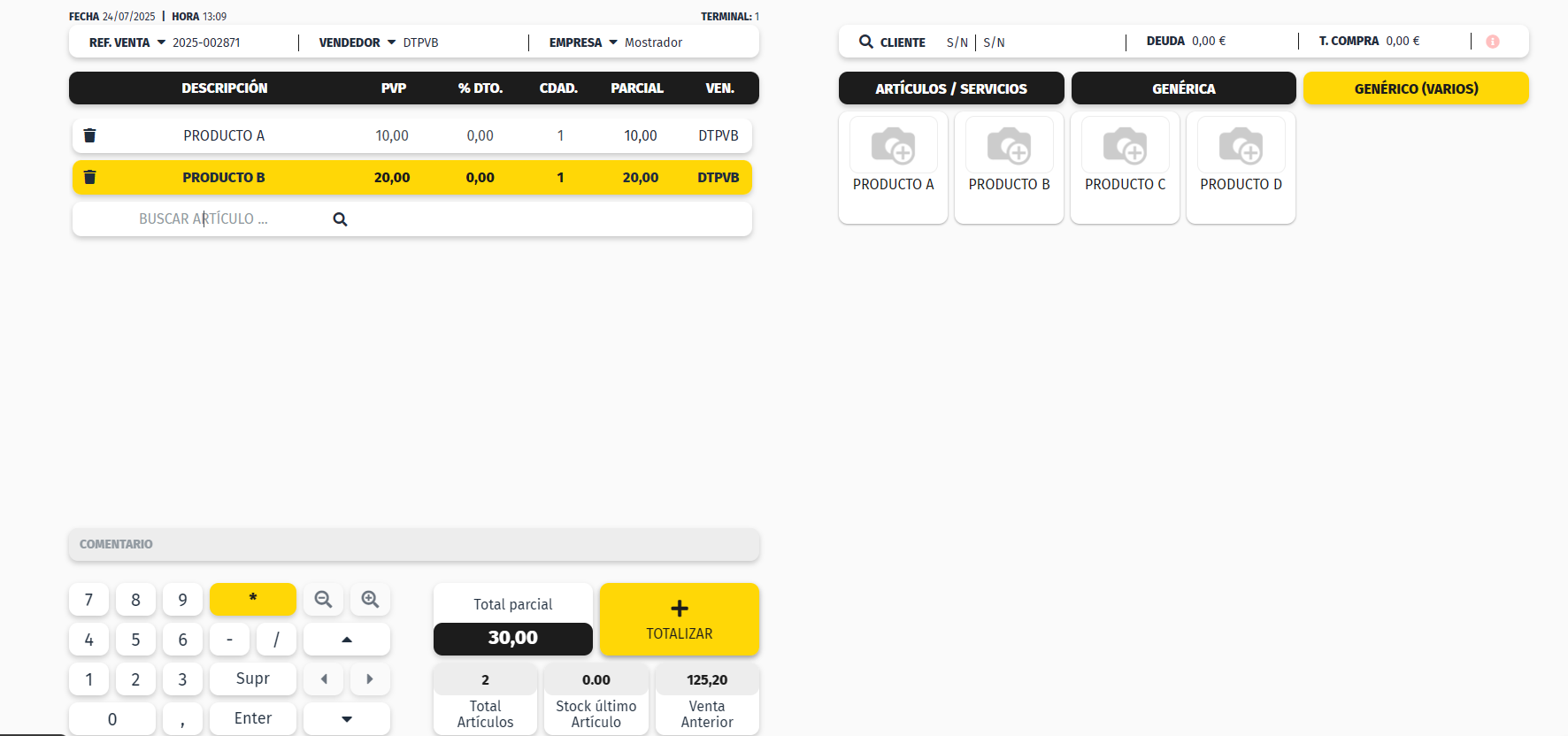 Una vez la venta está preparada, pulsa la tecla + Totalizar para pasar a la pantalla de totalización de venta.