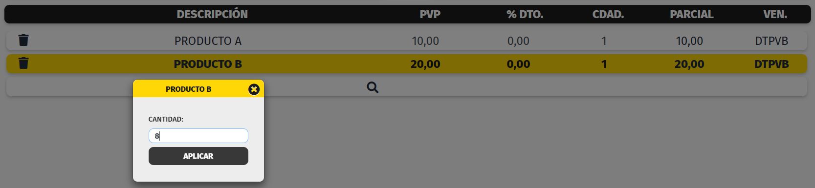 Al seleccionar un artículo, la cantidad a vender que aparece por defecto será 1 o en caso de haber seleccionado el artículo a través de un código de asignación, aparecerá la cantidad asignada.