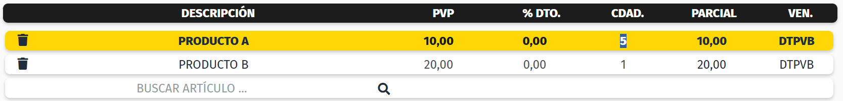 1. Sitúa el cursor en el campo cantidad de la línea donde está el artículo del que se desea modificar la cantidad. Cambia la cantidad y pulsa Intro.
