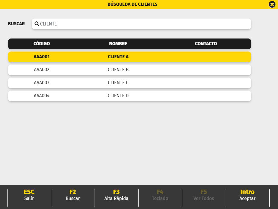 En cualquiera de los 2 casos anteriores, se mostrará un buscador desde la cual buscar el cliente que se quiere asignar a la venta. Selecciónalo y pulsa INTRO.