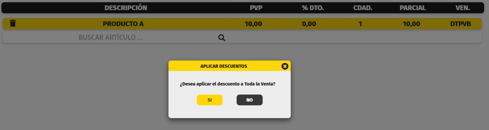 Si se quiere aplicar el descuento al artículo seleccionado, hay que pulsar en NO