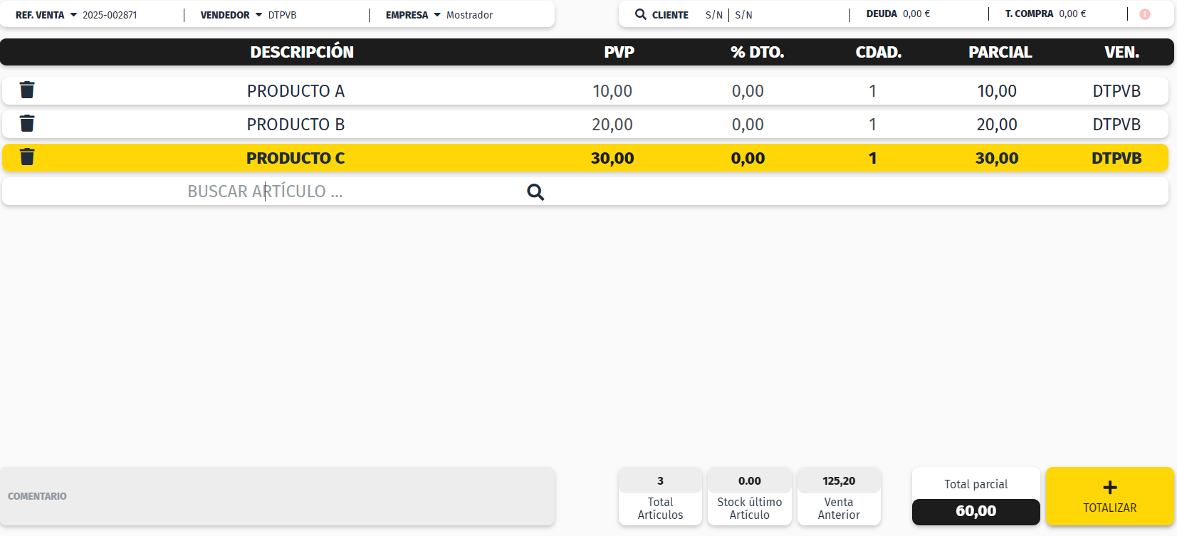 En caso de querer indicar el importe que entrega el cliente para que el software pueda indicarnos el cambio que deberíamos entregar, en el momento de pulsar + Totaliza, aparecerá el importe de la venta en color amarillo, y justo debajo, en un color mas oscuro aparece el importe mínimo que debe entregar el cliente. En caso de que el cliente entregue un importe superior al de la venta, se puede modificar el valor.