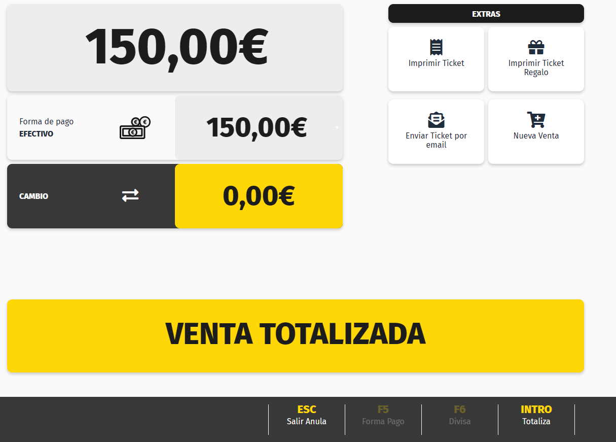 Una vez se pulsa Intro Totaliza, aparecerá una última pantalla indicando el cambio que debe entregarse al cliente y confirmando que la venta se ha totalizado.