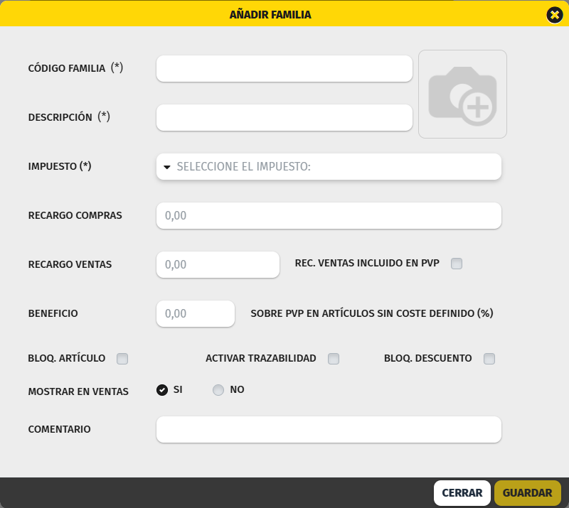 Código Familia : Campo Obligatorio, es un código entre 3 y 5 caracteres. Es un código libre y único, es aconsejable que tenga alguna relación con la descripción de la familia para poder identificarlo de forma ágil y eficaz.