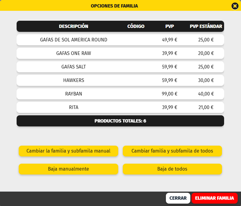 4.- Baja de todos directamente se muestra una pantalla para confirmar que vamos a dar de baja todos los productos de la familia