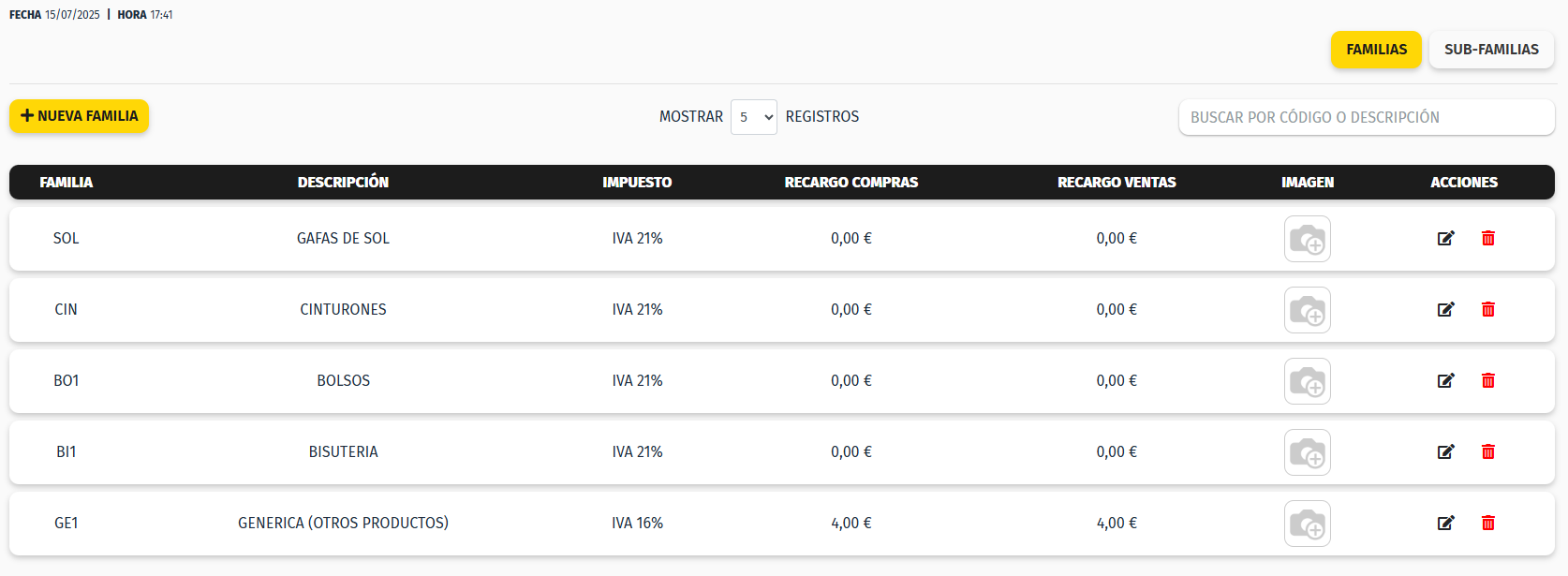 Una vez accedemos a la pantalla de Familias, podemos ver el listado de las familias creadas actualmente.