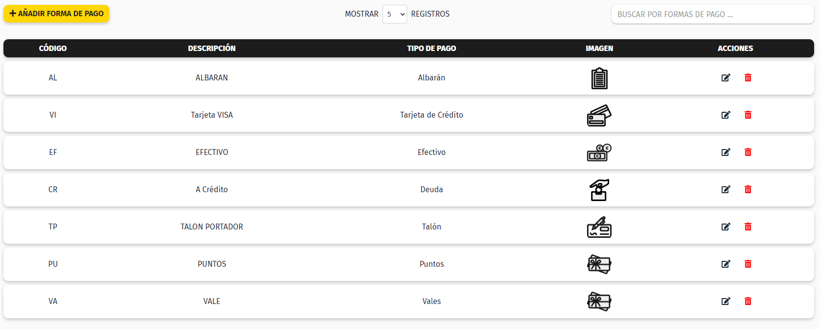 Para modificar una forma de pago, desde el listado donde vemos todas nuestras formas de pago, para cada una tenemos dos acciones disponibles. Con el icono del lápiz