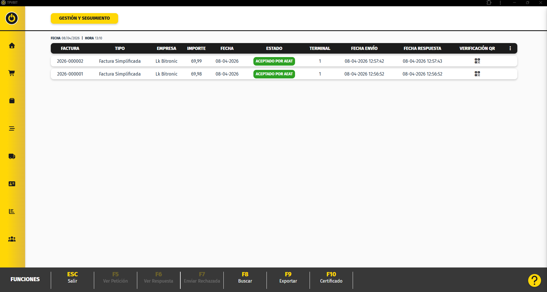 Desde el botón de Verifactu en el menú principal se accede a la pantalla de gestión y seguimiento de las facturas enviadas a la Agencia Tributaria.