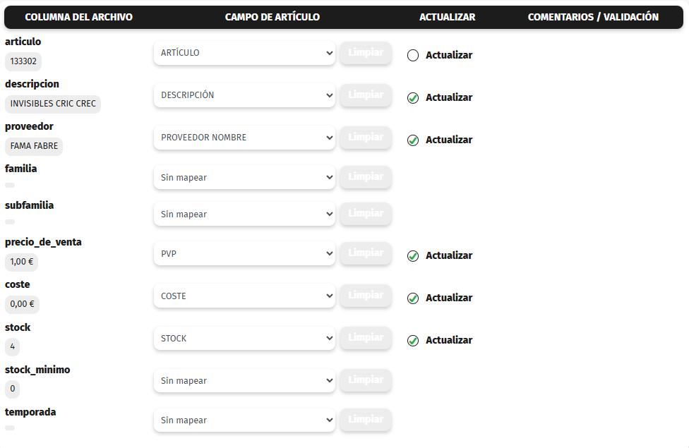 - Los campos que se van a actualizar en caso de existir el artículo.
