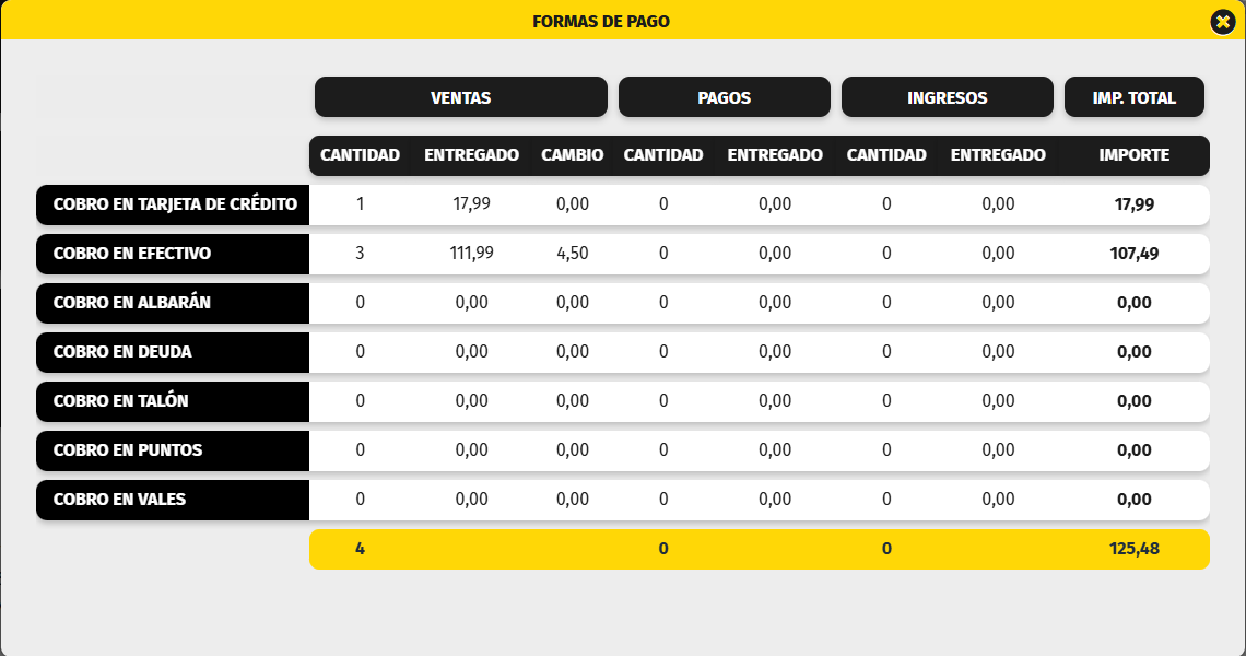 Formas de Pago abre un formulario para tener un resumen detallado de las operaciones por forma de pago