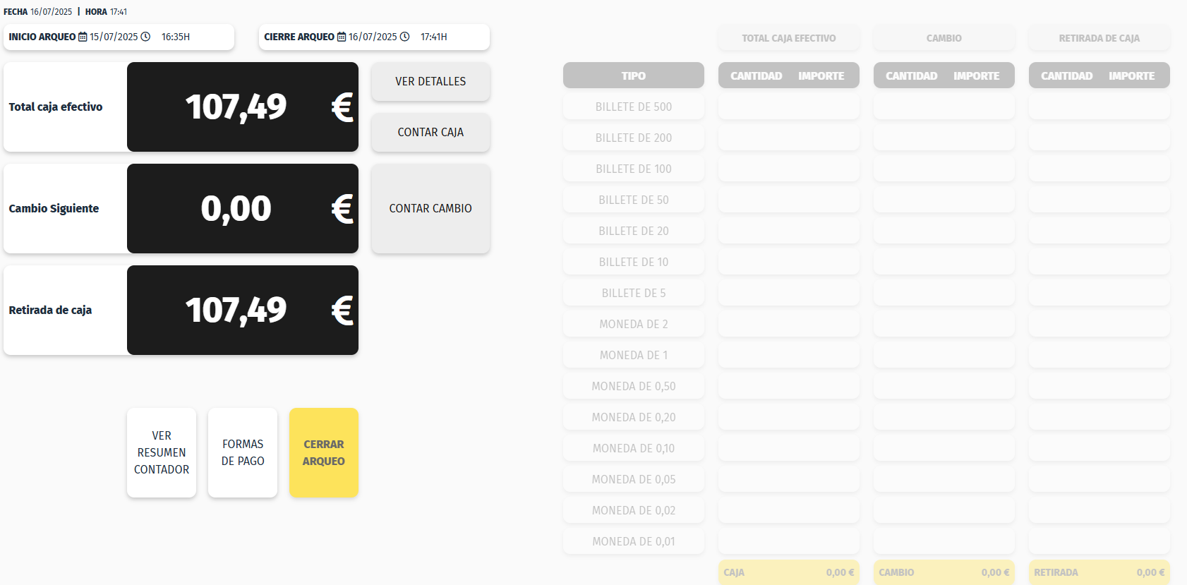 Y por último tenemos la opción de CERRAR ARQUEO sólo habilitado si hemos contado la Caja o hemos pulsado en F2 No Contar.