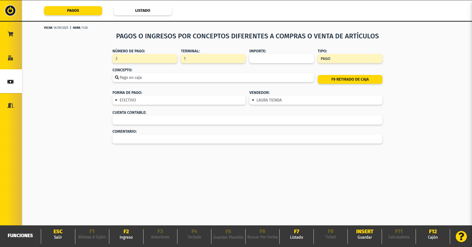 F2 Ingreso/pago nos permite alternar entre hacer un ingreso o un pago.