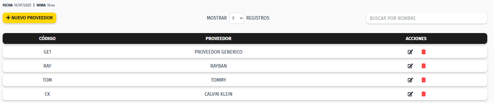 Una vez accedemos a la pantalla de Proveedores, podemos ver el listado de los proveedores creados actualmente.