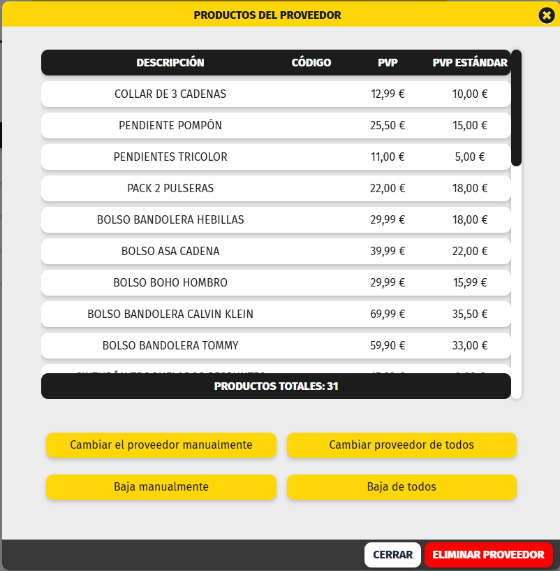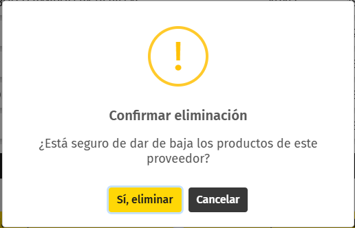 4.- Baja de todos directamente se muestra una pantalla para confirmar que vamos a dar de baja todos los productos del proveedor.
