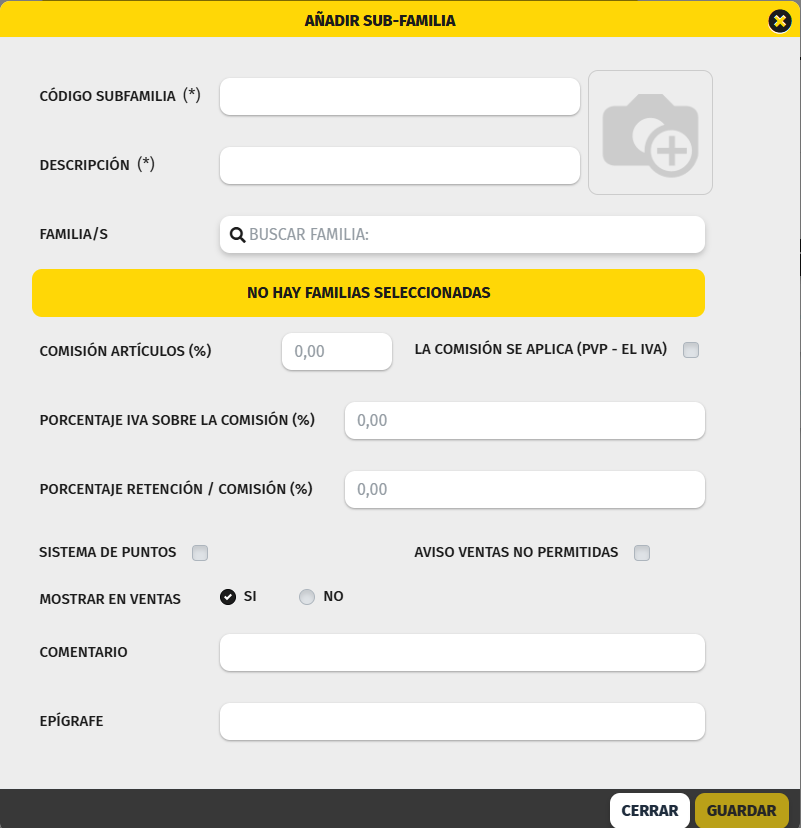 Comisión Artículos (%) : Las subfamilias permiten calcular los costes o beneficios de los productos que tienen comisión asignada. Lo habitual de los productos es que sean de compra/venta y que tengan un coste asociado en la compra. Pero en ocasiones los productos como loterías,tabaco,recargas telefónicas, medios de pago, el régimen es diferente y tienen asociado una comisión sobre la venta del producto (somos comisionistas). Es en este tipo de productos donde se aplicará el porcentaje de la comisión que se indica en el formulario.