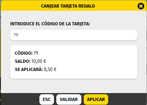 Al pulsar validar nos indica el importe de la TARJETA REGALO que estamos utilizando y el importe de la venta actual.