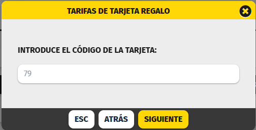 Al realizar una venta y seleccionar la forma de pago TARJETA REGALO nos aparece una pantalla donde nos solicita el código de la tarjeta.