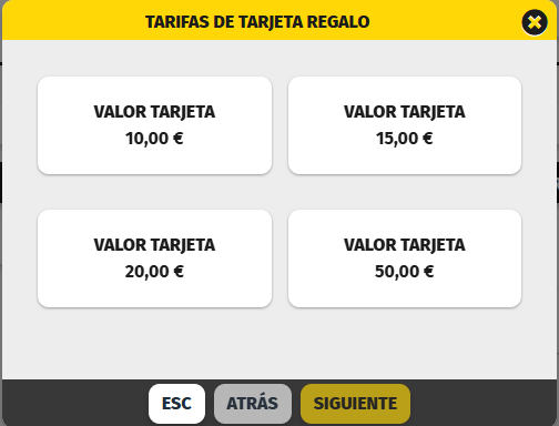 Al marcar el artículo tarjeta en la pantalla de ventas nos aparecerá la siguiente pantalla, donde elegiremos el importe y pulsaremos siguiente.