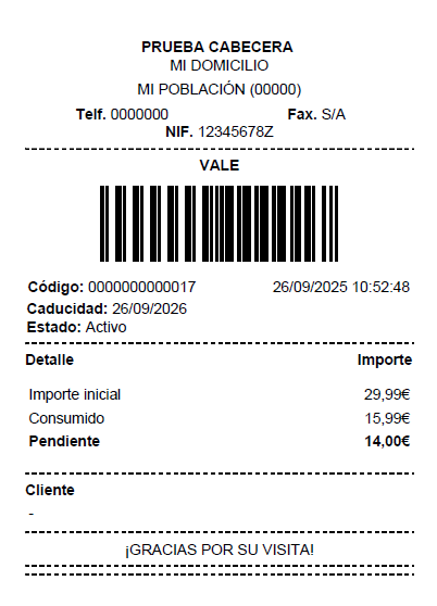 Al pulsar el botón EMITIR, se imprime el ticket del vale para que el cliente lo utilice en futuras compras.