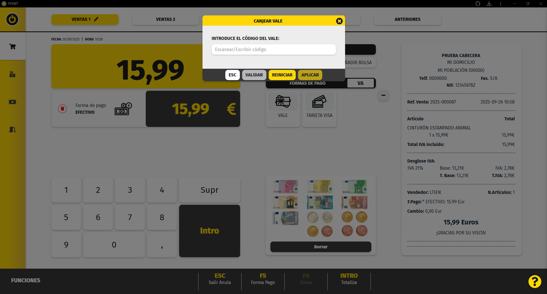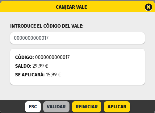 Al pulsar validar nos indica el importe del VALE que estamos utilizando y el importe de la venta actual.