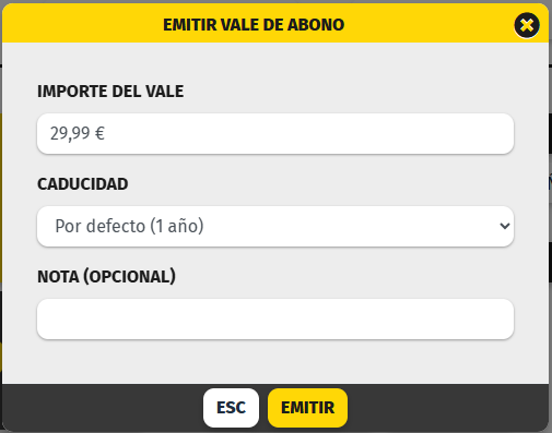 Al pulsar la forma de pago VALE, nos aparece una pantalla donde se indica el importe del vale, la caducidad (se puede modificar) y podemos escribir una nota.
